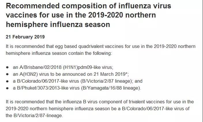 世界衛生組織推薦的2019-2020年度北半球季節性流感疫苗組份信息如下: