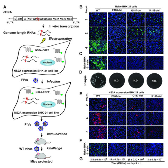 研究人員已改造后的DENV毒株為新疫苗開發(fā)平臺(tái),通過使用反向互補(bǔ)補(bǔ)充方法,將DENV野毒株的非結(jié)構(gòu)蛋白2A(NS2A)整合進(jìn)候選疫苗株內(nèi),拯救出弱感染力的DENV毒株-PIV?NS2A。對(duì)PIV?NS2A進(jìn)行培養(yǎng)發(fā)現(xiàn),其細(xì)胞感染率能達(dá)到107?IFU/ml,通過免疫小鼠發(fā)現(xiàn),PIV?NS2A能夠刺激機(jī)體T細(xì)胞免疫反應(yīng)及產(chǎn)生高效價(jià)的中和抗體,抵抗DENV野毒株的感染。